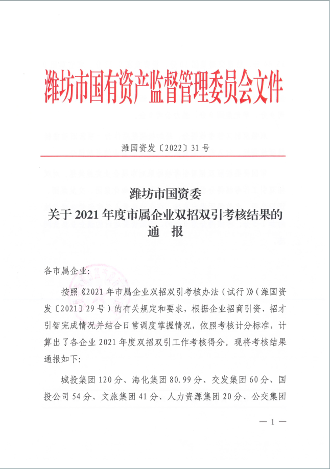 2021年,在市委、市政府正確領(lǐng)導(dǎo)和市國資委黨委的關(guān)心支持下,濰坊市國投公司全體干部職工上下一心,攻堅克難,招商引資工作取得了突破性進展。近日,市國資委印發(fā)《濰坊市國資委關(guān)于2021年度市屬企業(yè)雙招雙引考核結(jié)果的通報》(濰國資發(fā)﹝2022﹞31號),市國